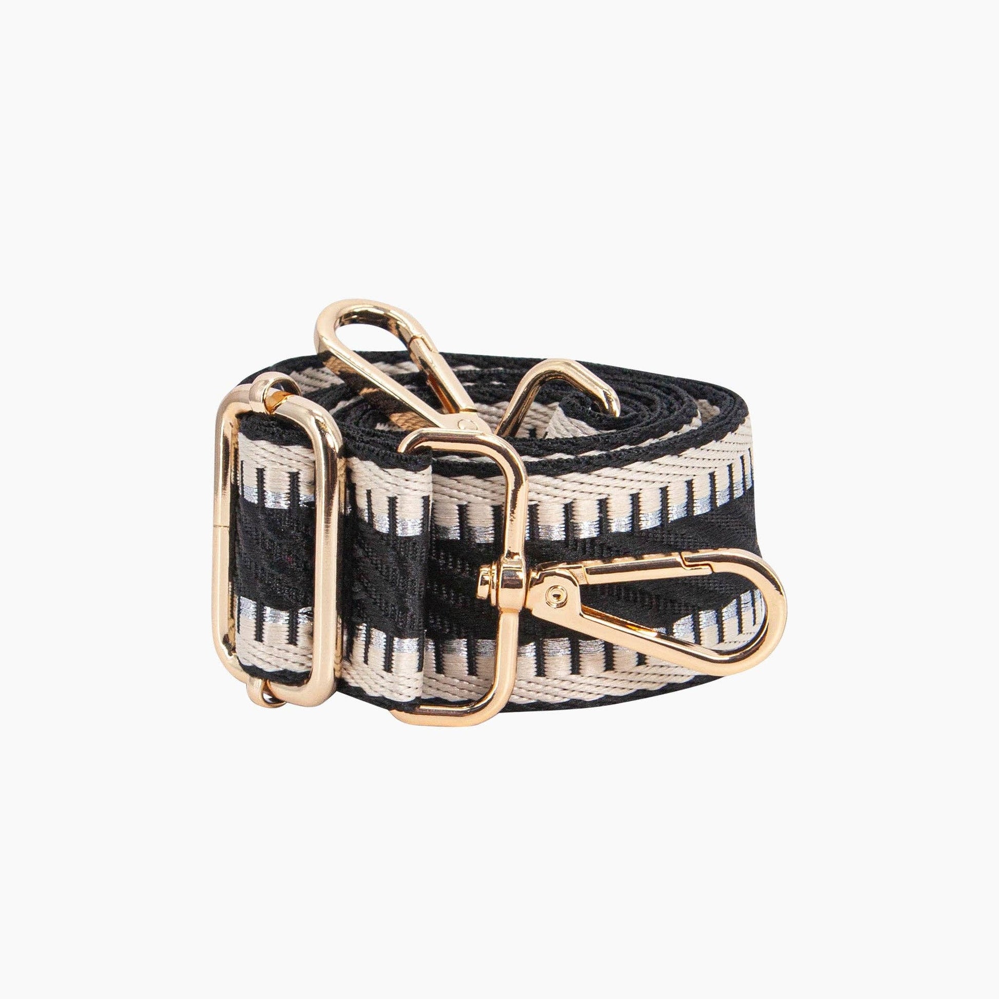 A classic black woven bag strap featuring a cream striped trim. Finished with convenient clip-on snap hooks, this strap can be effortlessly attached to your favourite bag.