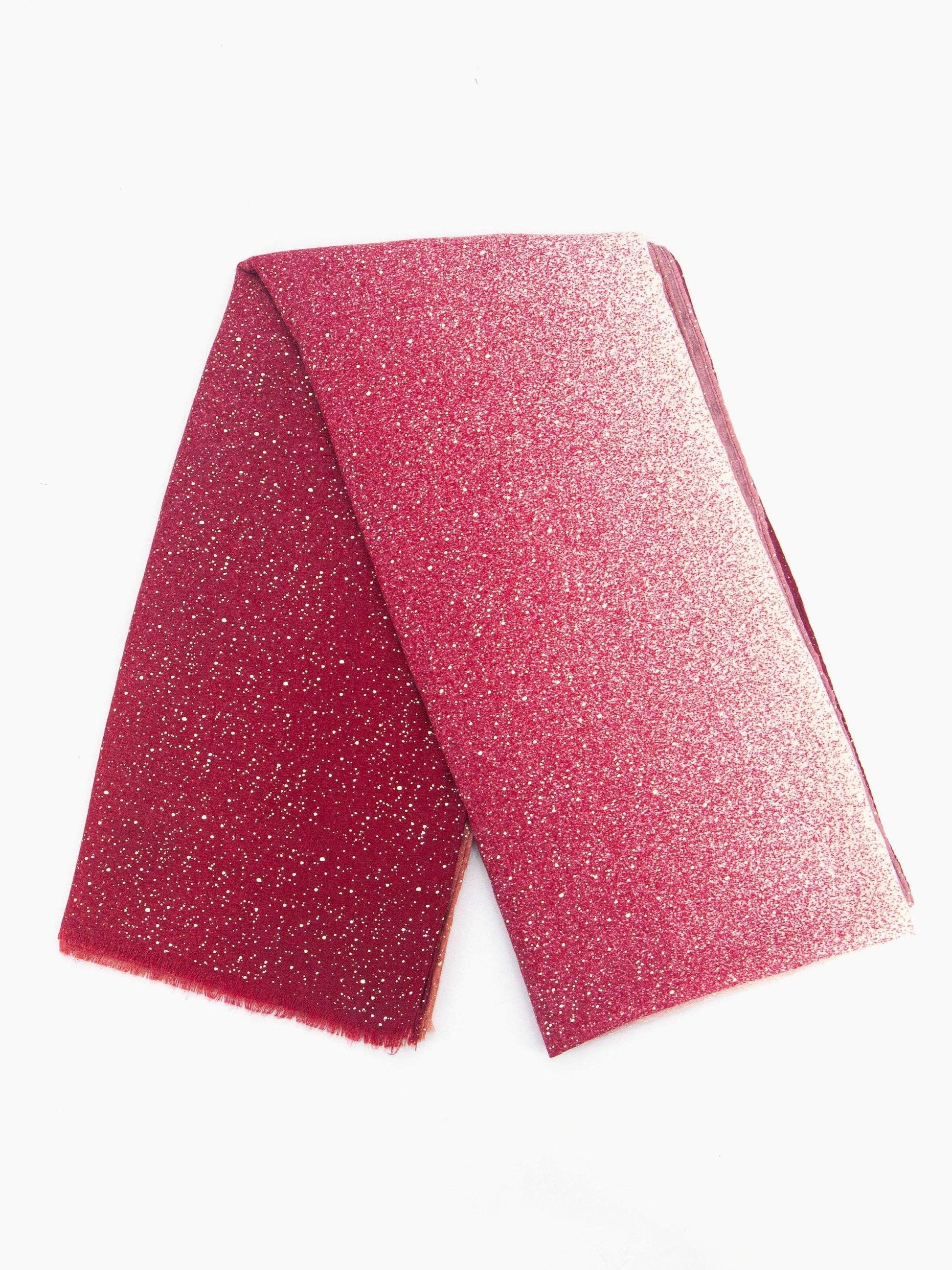 Showcasing an ombre of red and pink hues with speckled metallic foil highlights. Designed for versatility, this sparkly scarf can be worn many ways. FIT Lightweight scarf SIZE Length 180cm Width 90cm Depth 1cm 🧵 FABRIC Crafted from a lightweight viscose for a soft to the touch feel. 100% Viscose Delicate machine wash Do not tumble dry