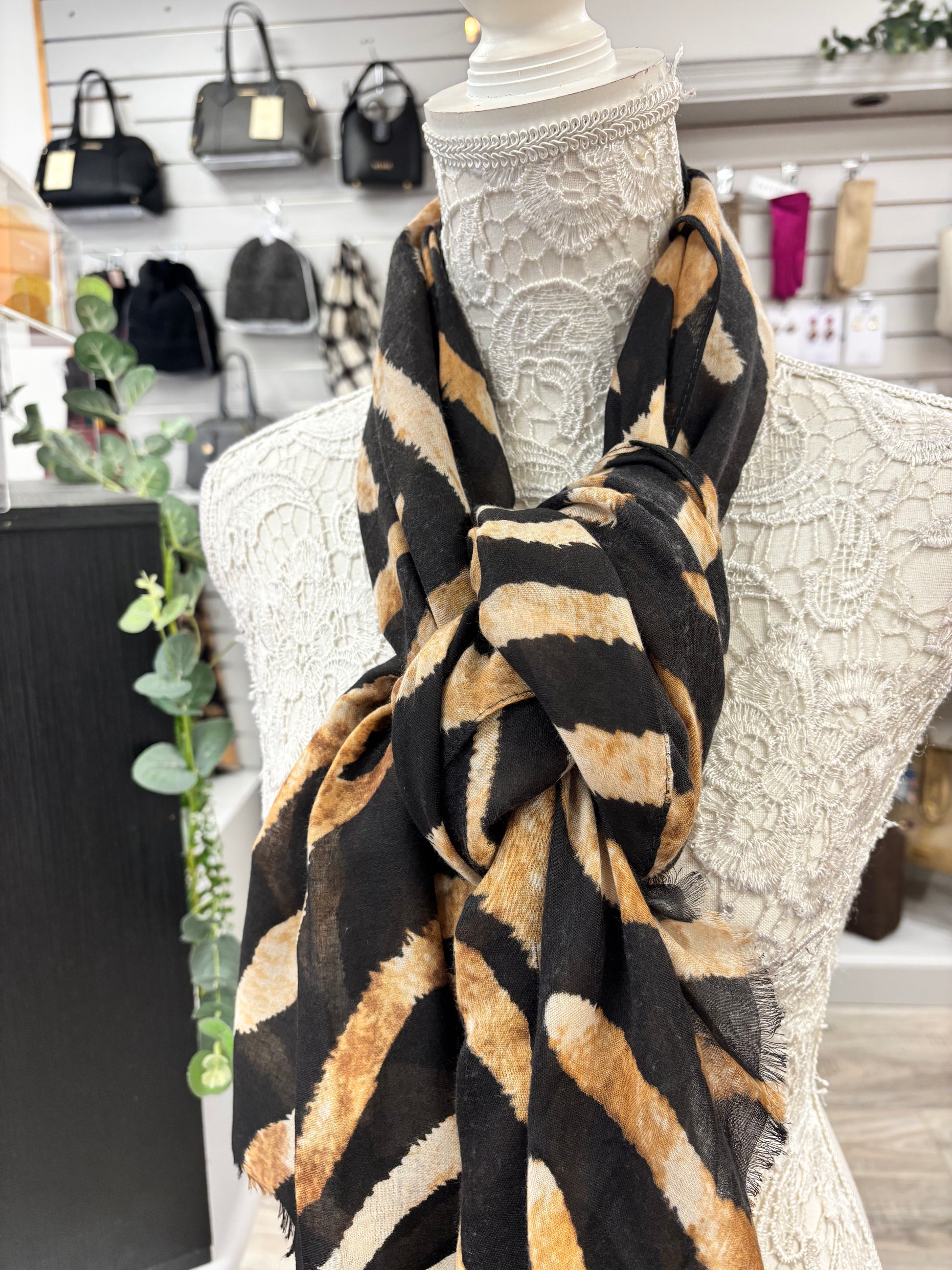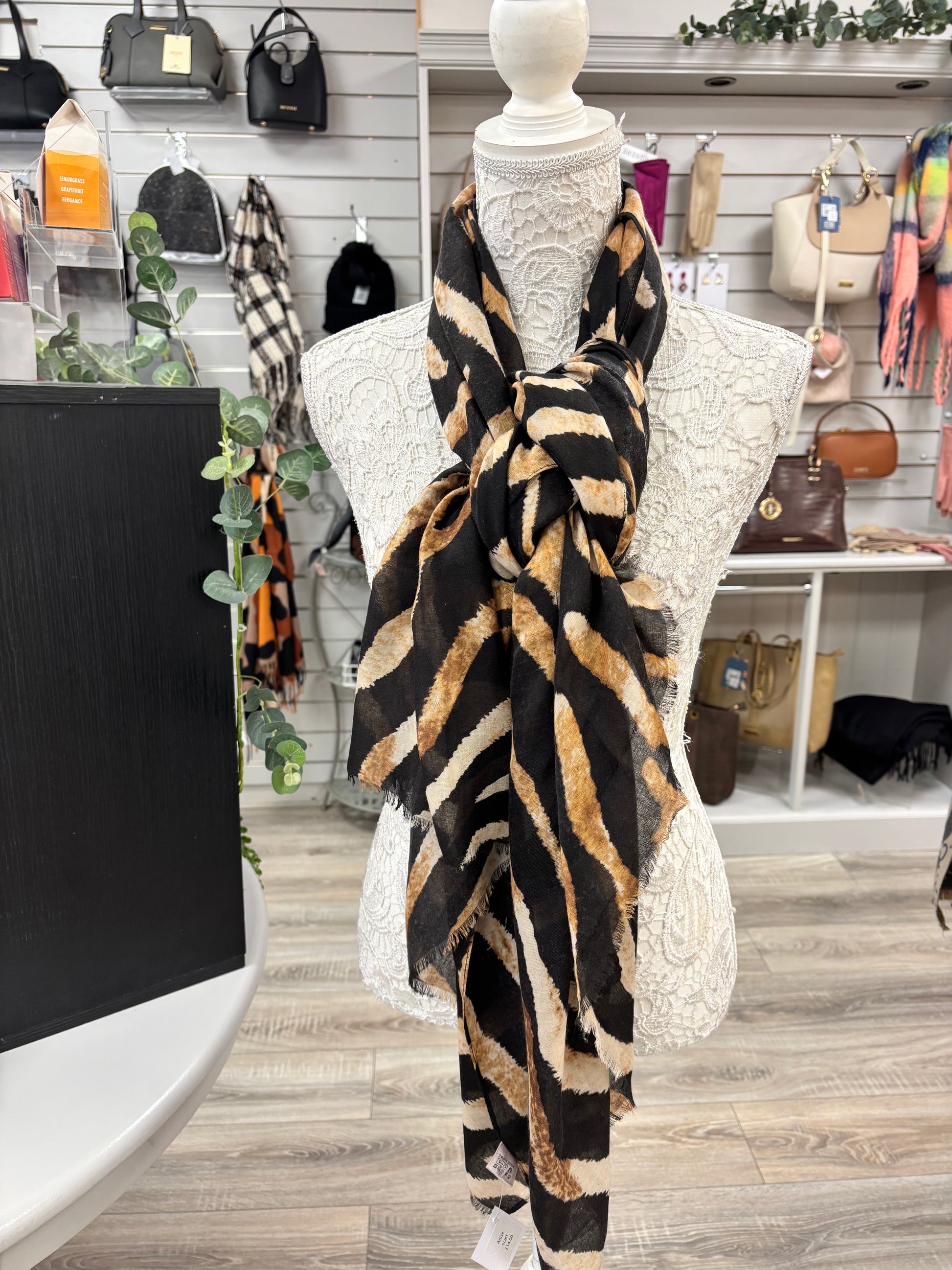 This Hazel Animal print scarf is a stylish and versatile accessory. Made with light weight material, it is perfect for year-round wear. The subtle animal print adds a touch of sophistication to any outfit. Elevate your wardrobe with this must-have piece.